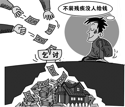 进站时还行走自如,换上破旧衣服后,就摇身变成了地铁上乞讨的残疾人员。近日,北京市公交总队民警将一名乔装残疾人乞讨的男子抓获,该男子因扰乱公共场所秩序被治安拘留。装瘸乞讨,伤害了人们的同情心,有关部门应加强监管,依法惩处乞讨行骗者,以遏制不劳而获的歪风。(时 锋)