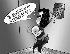 46岁的汪女士带着孙子被困电梯,她看到电梯门旁边有“紧急呼叫”的按钮,但按了半小时都没有任何反应。万般无奈之下,她只好将手机放在电梯门口的缝隙处,仔细地寻找信号。大约半个小时之后,手机终于有信号了,她给家人打通电话求救。(《华商报》)幸亏汪女士联系上了亲人,否则后果不堪设想,物业管理成了“无人”管理,此事当引起有关部门的警惕(陈银龙)