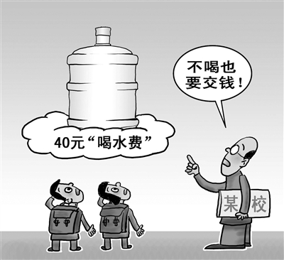 有媒体报道,安徽六安市椿树镇中心小学的一些家长反映,孩子在学校被要求缴纳每人40元的“喝水费”。就算孩子自己从家里带水去学校,也要交费。对此校方称,为确保学生饮水安全,校方提供了统一的桶装水,且是经销商从学生手中收取,学校不经手收费。国家对正常的教育收费历来都有明确规定,即使是正规费用,也需要严格履行相关的报批手续,并不是学校想收就能收的。学校一意孤行地收取“喝水费”,实则是乱摊派、乱收费,背离了教育的初衷。当地教育主管部门必须加强监管,不要让某些人借教育之名将黑手伸向孩子。 (时锋)