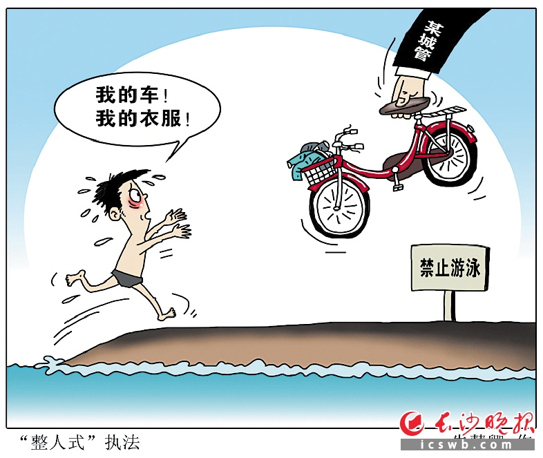 其次,在执法过程中,既然“经说服有4辆车按照线位停放”,为何不能将毕国昌的自行车也矫正归位?就算一时找不到人,城管也只需到海滩吆喝两声便可得到回应。强行将违规者的自行车锁链剪断并没收其衣物,并非只是懒政那么简单,而是要等着瞧游泳者赤裸上岸献丑和焦急寻找衣物的落魄窘态。这种整人式执法,往深处思考,显然已经不只是执法方式的问题,而是漠视公民人格、罔顾公民权利的违法之举。