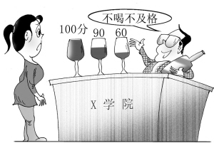 “你们出去是干销售的,就是要会喝酒!”说这句话的是贵州安顺职业技术学院中药制药专业的一位顾姓老师。本月11日,该专业的数十名毕业生经历了一场特殊的考试,考场上没有试卷,而是数十个一次性纸杯和散装白酒,考试成绩由喝酒多少来决定。据学生们说,老师称,如能喝完一杯酒,就得100分,喝半杯得90分,一口不喝不及格。(4月13日央广网)