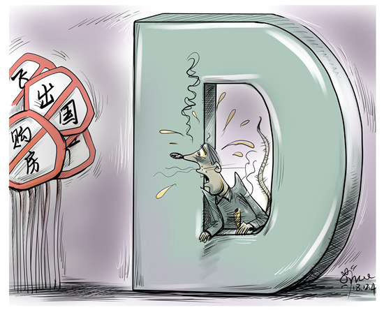 近日,国家税务总局发布了《重大税收违法失信案件信息公布办法》,欠缴税款金额10万元以上的纳税人纳税信用级别直接判为D级。根据相关规定,对有履行能力但拒不履行的严重失信主体实施阻止出境、限制购买不动产、乘坐飞机、乘坐列车软卧、G字头动车组全部座位和其他动车组一等以上座位、旅游度假、入住星级以上宾馆及其他高消费行为等措施。(《每日经济新闻》12月4日)漫画:徐简