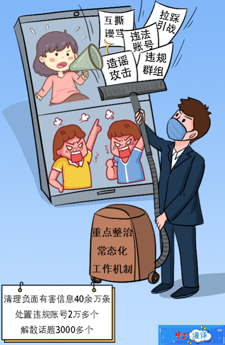通过多方合力,扎实行动,“饭圈”整治取得了“浓、严、强、建”的具体成效,成果触目可见、触手可及,及时回应了主流民意的期盼。但我们更应当认识到,“饭圈”清理整治并非一蹴而就,仍需社会各界持续发力。只有不断强化完善常态化治理机制,加强引导网民对“饭圈”乱象本质和危害的认识,才能守住底线,遏制泛娱乐化的野蛮生长,从而根治“饭圈文化”畸形乱象。