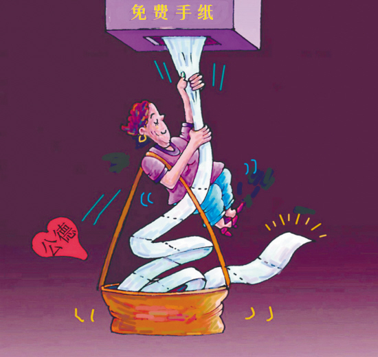 浪费免费手纸,从根本上讲,是公共意识缺失的表现。由于培养公共意识的平台与载体较少,并缺少必备的机制促进与倡导,就会形成恶性循环:一方面表现在公共资源相对匮乏,公共资源越贫瘠,人的占有欲望越强;另一方面表现在公共秩序混乱,“随大流”的从众心理加剧,“浑水摸鱼”的成本较小。从善如流的从众效应需要光大,从恶如崩的从众效应必须遏制。这是公共意识与公民责任都必须具备的“公品质”。