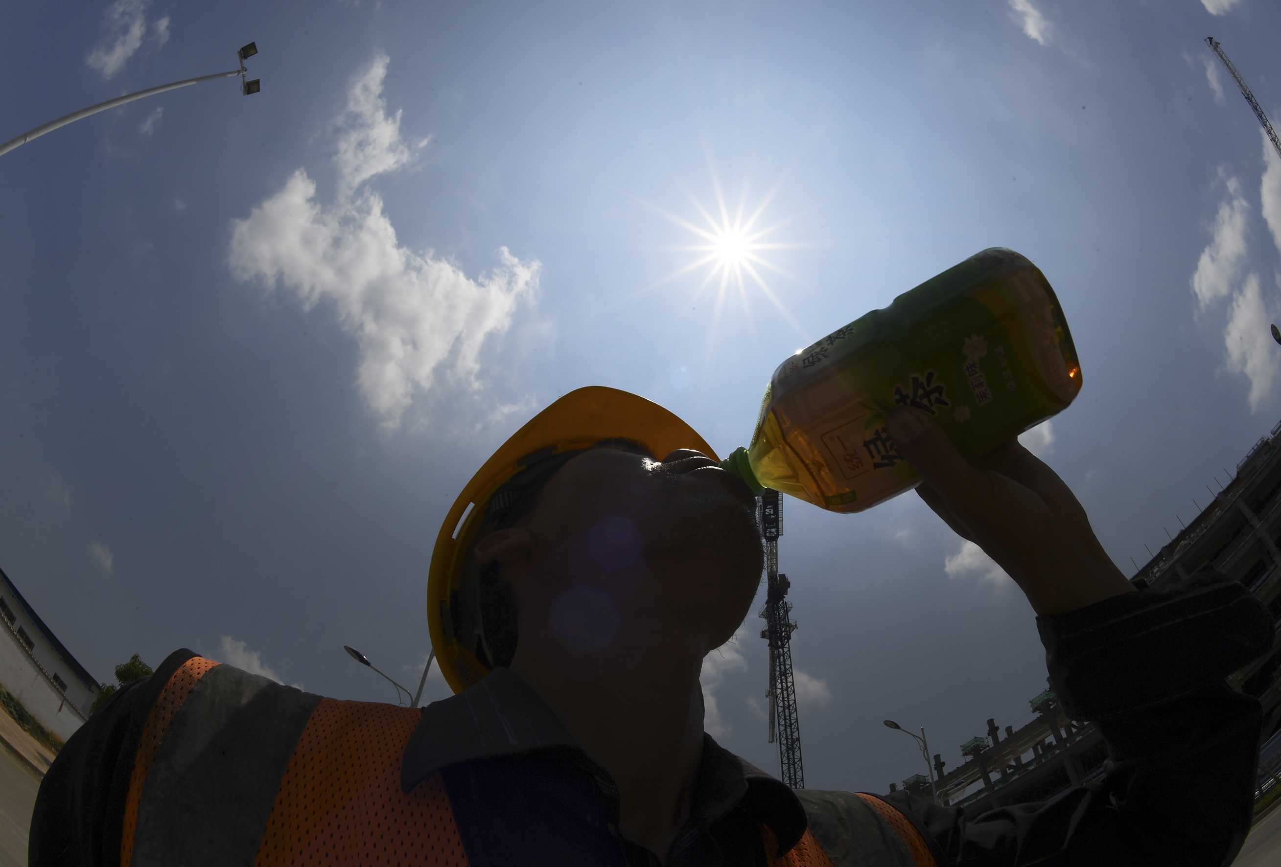 图为,柳州市市政维护处的道路养护工人在烈日下喝水解渴。图片来源,新华社发(黎寒池 摄)。