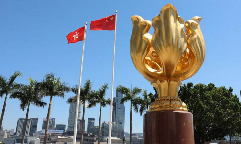 图为,在香港金紫荆广场上,五星红旗和紫荆花旗迎风飘扬。图片来源,新华社。