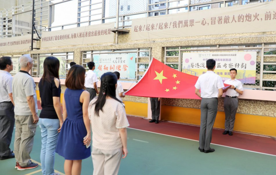 图为,8月5日在香港岛北角的培侨中学内拍摄的升旗典礼。图片来源,新华社。