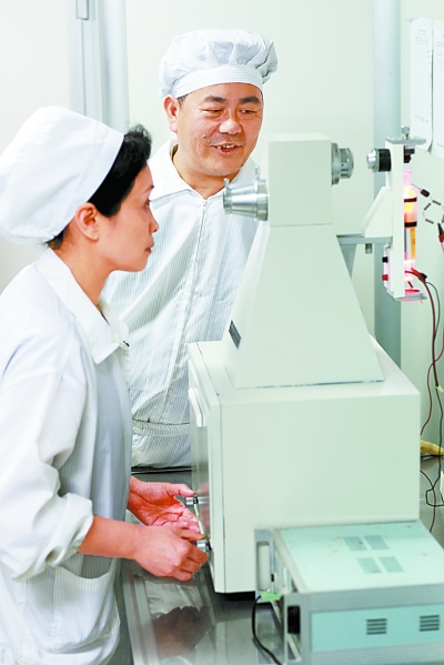 激光陀螺技术创新团队黄云教授(左)与李晓红教员在工作中。本报通讯员 何书远摄
