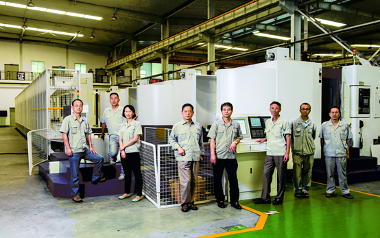 宁江机床总工程师刘雁(左四)和他的团队承担了精密卧式加工中心、高速卧式加工中心两项研制任务。(雷宇 摄)