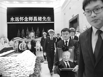 追悼会结束后,工作人员为师昌绪院士移柩,儿子师宁抱着老人的遗像走在前面。记者 董立龙摄