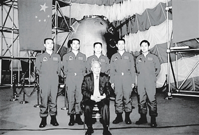 神舟五号载人飞船发射成功后,梁思礼与杨利伟等5名中国航天员合影。