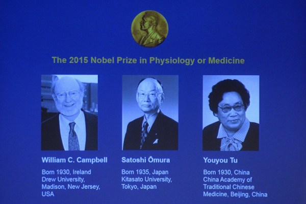 当地时间2015年10月5日,瑞典斯德哥尔摩,诺贝尔委员会举办新闻发布会,宣布2015年诺贝尔生理学或医学奖得主。中国药学家屠呦呦,爱尔兰科学家威廉·坎贝尔、日本科学家大村智分享该奖项。
