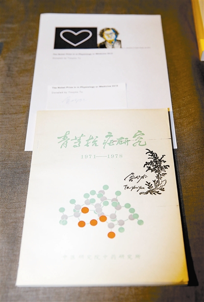 上图 6日在瑞典斯德哥尔摩诺贝尔博物馆拍摄的屠呦呦签名的《青蒿抗疟研究》(1971-1978)。这本书汇集屠呦呦团队早期抗疟研究的成果,记载了青蒿素发现的过程。屠呦呦当日在诺贝尔博物馆参加“诺贝尔周”活动时将这本图书赠送给了诺贝尔博物馆。(新华社记者 叶平凡 摄)