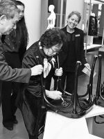 ◆6日,在瑞典首都斯德哥尔摩,中国女药学家屠呦呦在椅子上签名,并将其赠送给诺贝尔博物馆。 新华社发