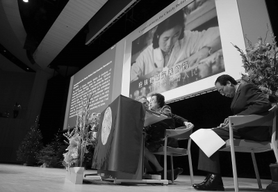 身着宝蓝色套裙的屠呦呦和另两位该奖得主大村智及威廉·坎贝尔缓缓步入礼堂,一同就座。在大村智和坎贝尔分别演讲后,屠呦呦用中文开始了主题演讲《青蒿素——传统中医给世界的一份礼物》。