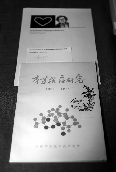 ▶这是12月6日在瑞典斯德哥尔摩诺贝尔博物馆拍摄的屠呦呦签名的《青蒿抗疟研究》(1971-1978)。这本书汇集屠呦呦团队早期抗疟研究的成果,记载了青蒿素发现的过程。屠呦呦及其他九位2015年诺贝尔各奖项得主当日受邀参加诺贝尔博物馆活动,并向博物馆赠送个人纪念品。 新华社记者 叶平凡摄