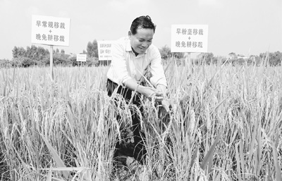 韦本辉在考察用粉垄技术种植的水稻长势。胡 泊摄