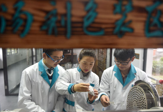 3月21日,潘丽婷(中)在指导团队成员核对即将放入煎药机中的药材。潘丽婷是福建中医药大学药学院大三学生。经过选拔后,她以“堂主”身份入主该校“承创堂”中医馆,被称为象牙塔里的“女医明妃”。“承创堂”是福建中医药大学的大学生创业扶持项目。新华社记者 宋为伟/摄