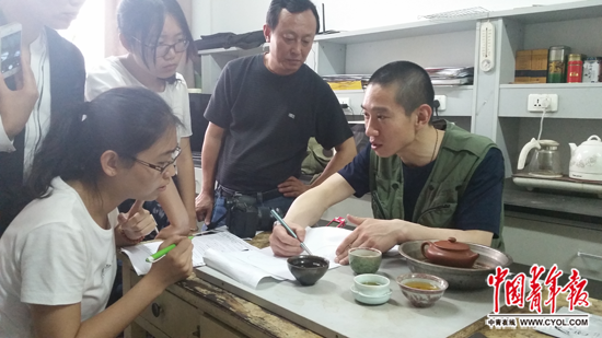 韩春雨(右一)向记者介绍他的科研成果 中国青年报·中青在线记者 樊江涛/摄