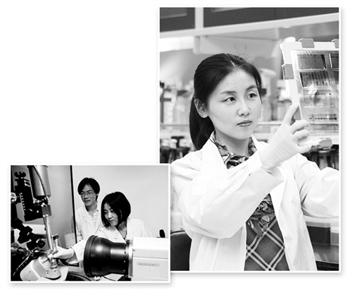 左图 颜宁(右)跟同事在做实验。 (资料图片)