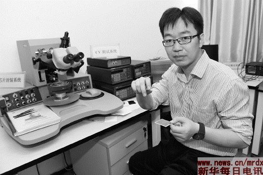 ▲盛况正准备利用仪器对半导体芯片进行封装(5月23日摄)。 新华社记者黄宗治摄