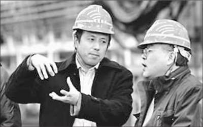 施工现场,杨华勇(左)在与同事进行技术交流。资料照片