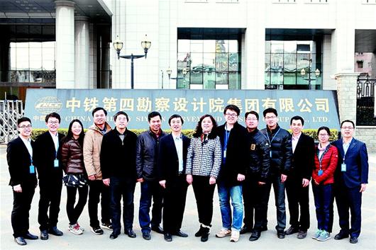 湖北日报讯 图为:今年2月26日,“高速铁路500米长焊接钢轨生产系统集成创新与应用”课题主要人员在铁四院大楼前合影留念。 (视界网 欧巍 摄)