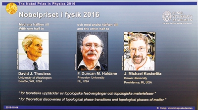 据新华社电 瑞典皇家科学院4日宣布,将2016年诺贝尔物理学奖授予戴维·索利斯、邓肯·霍尔丹和迈克尔·科斯特利茨这三名科学家,以表彰他们在物质的拓扑相变和拓扑相方面的理论发现。