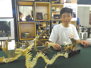 刘云良和他的“鱼骨造型”作品。(陈朝霞 摄)