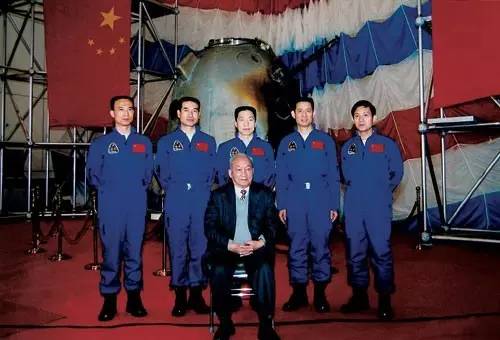 △ 神舟五号发射成功后,梁思礼与航天员合影。