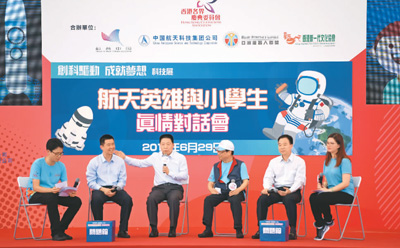 6月29日,在香港维多利亚公园举行的“创科驱动成就梦想”科技展上,航天员杨利伟(左三)、景海鹏(右二)、陈冬(左二)与香港小学生互动,回答关于航天科技的各种问题。新华社记者 秦 晴摄