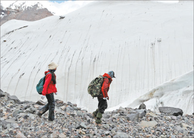 近日,徐柏青(右)带着学生走在唐古拉山龙匣宰陇巴冰川旁的碎石滩上。索朗罗布摄(新华社发)