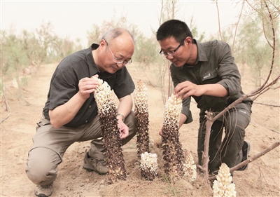 屠鹏飞(左)和博士生在于田县检查管花肉苁蓉的结果情况。