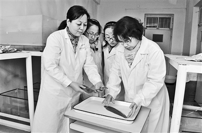图为2016年秋天,史秋梅(左一)在实验室对养殖户送检的半滑舌鳎鱼做病情检查。 (资料片) 高桂生摄