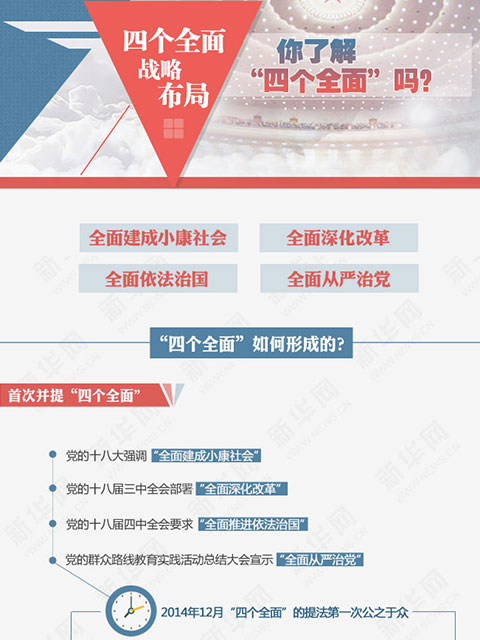 “四个全面”既不是简单的并列关系,也不是简单的施政之策,而是一整套治国方略,有着博大精深的思想体系。“四个全面”相辅相承、相互贯通,每一个全面都有其重大战略意义,都有其重大思想理论构架,又共同构成治国理政的顶层设计。“四个全面”的协调推进,指向的正是中国梦的实现,正是亿万人民的更多福祉。
