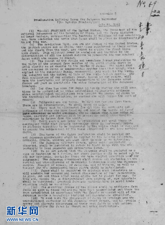 新华网北京7月25日电 (记者陈聪)70年前的7月26日,一份奠定战后国际秩序基础的重要文件——《波茨坦公告》发表。抚今追昔,时隔70年后重温这段历史,依然令人深感其意义深远而重大。
