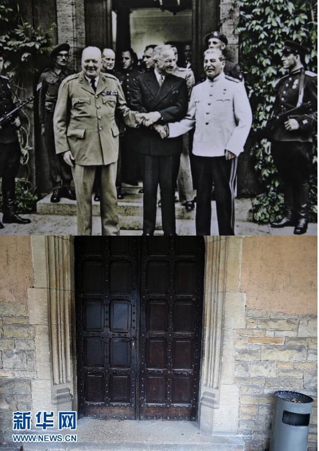 这张拼版照片的上图是记者翻拍的苏联、美国和英国三国首脑斯大林(右)、杜鲁门(中)和丘吉尔参加波茨坦会议的资料照片;下图是2015年7月23日拍摄的波茨坦会议旧址一角。新华社记者 张帆摄