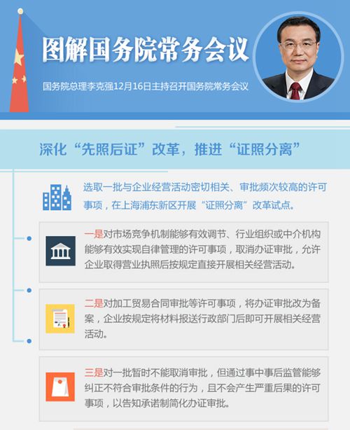 11月下旬,李克强总理考察上海自贸区时,就要求有关负责人将在上海自贸区试点实施的“证照分离”改革,尽快给国务院上报方案。不到一个月的时间,12月16日,李克强总理又在国务院常务会议上再次要求深化“先照后证”改革,开展“证照分离”试点,着力缓解办证难,激发“双创”活力。