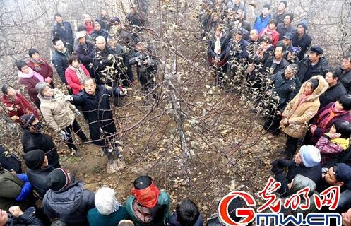 图为李保国教授在为村民示范果树剪枝。(资料图片)