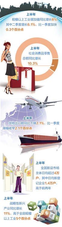 上半年,我国经济保持了总体平稳、稳中有进、稳中有好的发展态势。国内生产总值同比增长6.7%,这一中高速增长伴随着就业增加、收入提高、生态改善、结构优化、效益回升,既有工业企稳、服务业较快增长的有力支撑,又有消费稳定增长、出口降幅收窄拉动的作用,还有新经济加快成长、新旧动能有序转换的贡献
