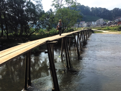 9月21日,枯水期红军桥的木梁显露出来,一名村民从少寨走出,去往桥西的集镇。新京报记者 李明 摄