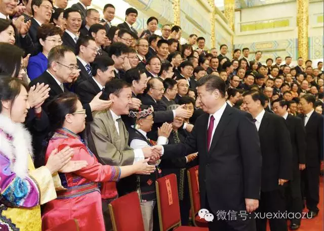(7日)上午9时30分,习近平等来到人民大会堂金色大厅,同代表们亲切握手,并合影留念。