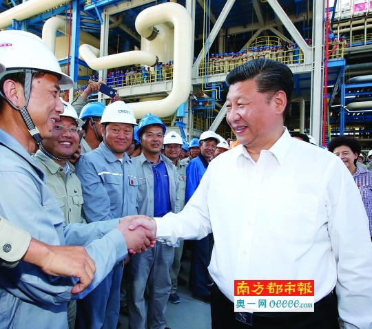 2016年7月18日至20日,中共中央总书记、国家主席、中央军委主席习近平在宁夏调研考察。这是7月19日下午,习近平在宁东能源化工基地慰问煤制油项目技术研发团队。新华社发