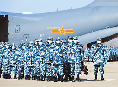 2月17日,军队增派支援武汉抗击新冠肺炎疫情的又一批1200名医务人员,分别通过航空和铁路输送抵达武汉。图为医疗队队员抵达武汉天河机场后快速集结。解放军报记者 王传顺摄