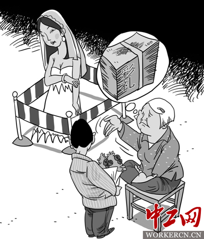 近年来,一些地方的婚礼陈规陋习有所抬头,导致奢靡浪费、攀比之风蔓延。据《人民日报》报道,在一些农村地区,彩礼拿秤称,娶媳妇的“价码”是3斤3两的百元大钞,加起来得有10多万元,更有男方父母千方百计将人民币一张张用水浸湿后再用抹布擦干,为的就是过秤时,更“压分量”。