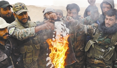 当地时间3月26日,叙利亚政府军士兵在台德穆尔焚烧“伊斯兰国”的旗帜。东方IC 供图
