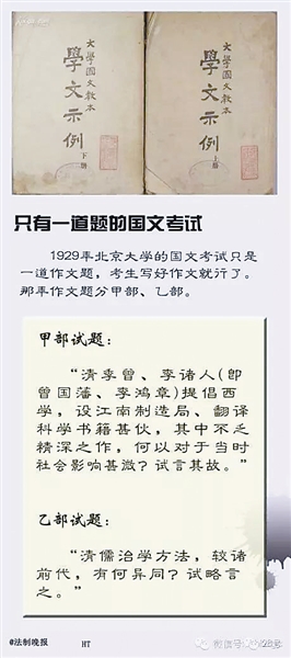 相比于今天的考卷,民国考题更多了几分“文化味”。以1929年北京大学国文考题为例,当年考题分甲部、乙部,其甲部试题是:“清季曾、李诸人提倡西学,设江南制造局、翻译科学书籍甚伙,其中不乏精深之作,何以对于当时社会影响甚微?试言其故。”乙部试题是:“清儒治学方法,较诸前代,有何异同?试略言之。”