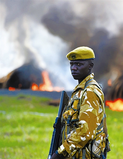 4月30日,在肯尼亚内罗毕,一名野保警察在焚烧象牙和犀牛角的现场警戒。新华社记者 孙瑞博摄