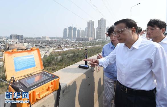 8月16日下午,中共中央政治局常委、国务院总理李克强到天津港“8·12”瑞海公司危险品仓库特别重大火灾爆炸事故现场隔离区,察看救援搜寻、清理处置等情况。这是李克强察看事故现场环境监测情况。新华社记者 张铎 摄