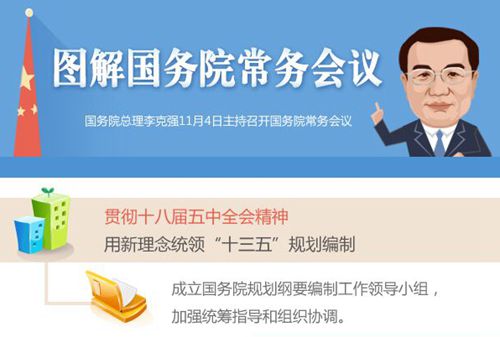 11月4日,国务院总理李克强主持召开国务院常务会议,部署贯彻党的十八届五中全会精神,用新理念统领“十三五”规划编制。会议决定,成立国务院规划纲要编制工作领导小组,加强统筹指导和组织协调。会议要求,各相关部门要广泛听取意见建议,按照创新、协调、绿色、开放、共享的发展理念,围绕增后劲、补短板、促均衡、上水平,编制出遵循发展规律、体现改革开放要求、反映群众意愿的规划纲要和配套专项规划。